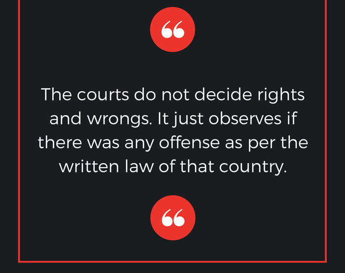 The courts do not decide the rights and wrongs. The court just observes if the actions of the person is offense as per the written law that they follow.