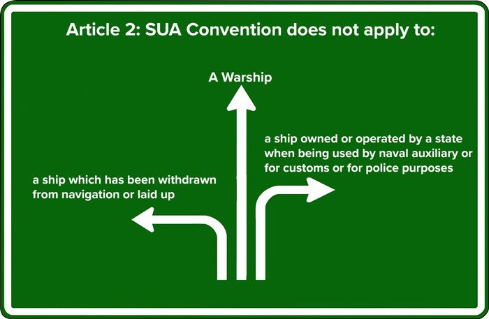The convention applies to all the ships navigating in the high seas. Article 2 of the SUA convention defines the applicability of the convention by defining ships for which the convention do not apply.