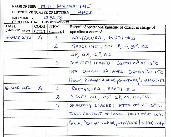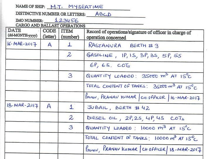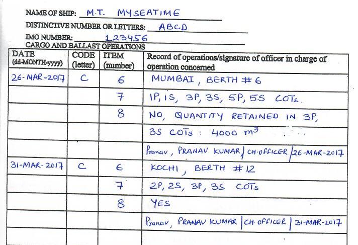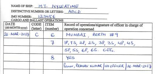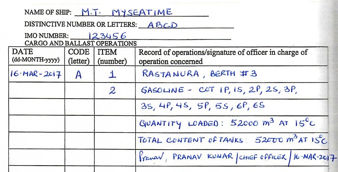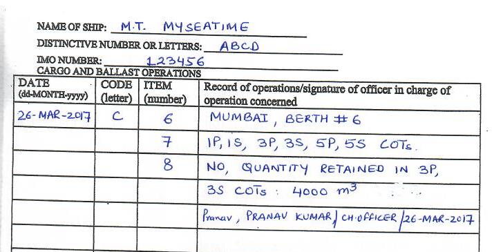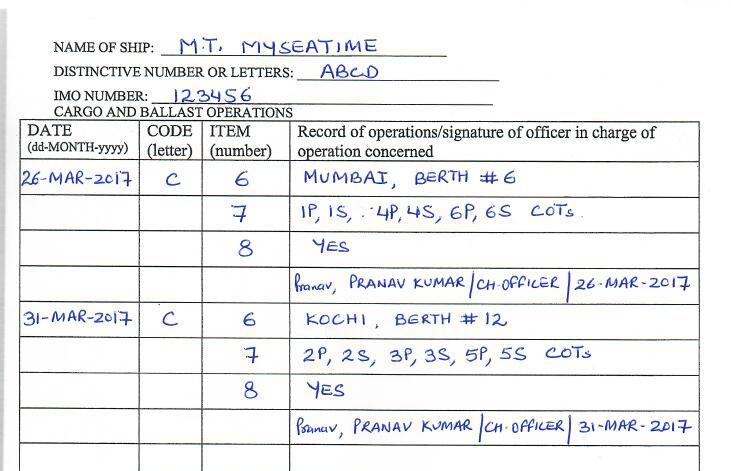 Let us see an example of how each row need to be filled in cargo record book.