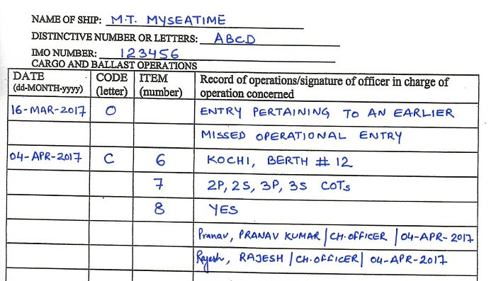 In this entry, the date corresponding to Code “O” is the date when the operation was carried out. The date corresponding to the missed entry (in this case code C) is the date when the entry is now being made in the oil record book.