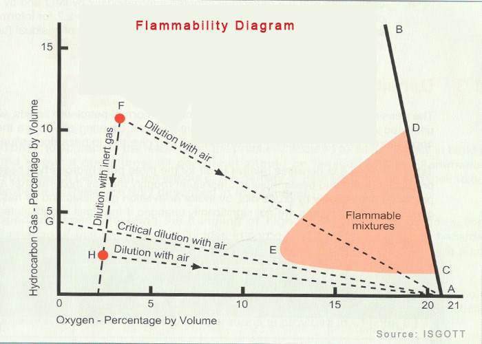 It is thus required to first reduce the concentration of flammable vapors by inert gas to a point H . After this when we introduce air inside the tank, the dilution of flammable mixture will follow the line HA which ensures that we are never in the flammable range during this process.