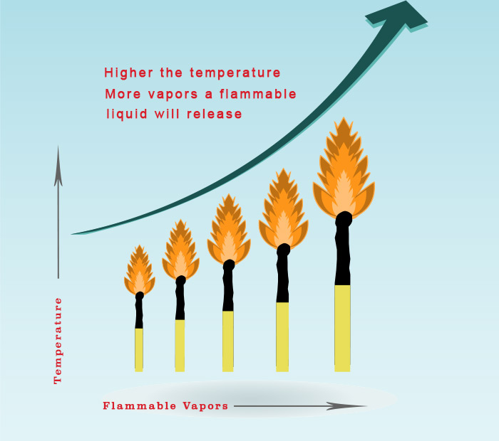 It won’t be hard to believe that with more temperature, the liquid will vaporise more. And at some temperature it will release sufficient vapors to form a flammable mixture.
