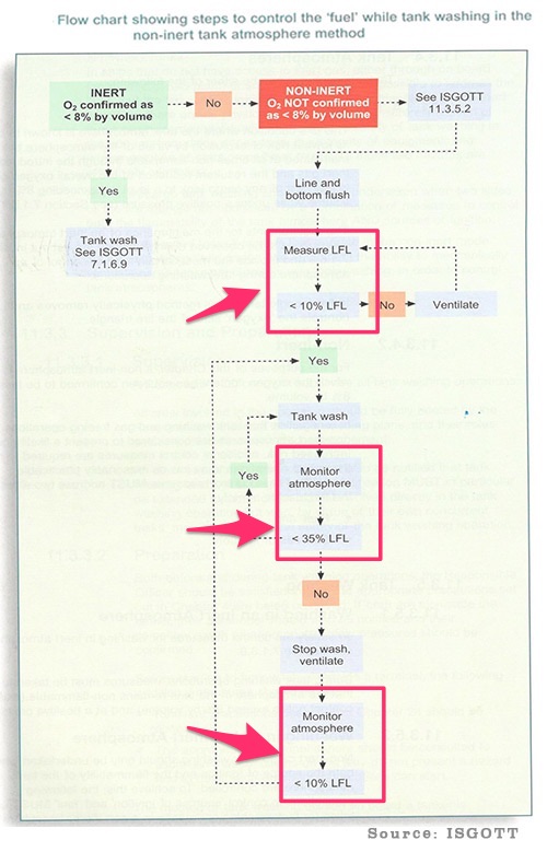 This is the flowchart for tank cleaning on oil tankers in non-inert atmosphere. If you notice the flowchart tries to maintain the hydrocarbon concentration between 10% to 35% LEL. The whole idea is not to allow the tank atmosphere reach in the flammable range (100% LEL).